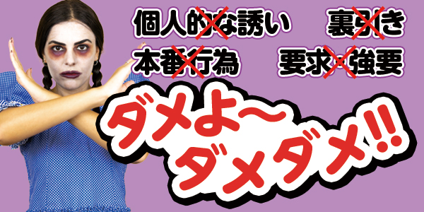 これ、あるあるっぽいですがお店にとっては結構重大なんです。もちろん全セラピストに禁止事項を徹底指導をしてますが、それでも裏引きに手を出すセラピストが存在するのも事実です。これでは真面目に頑張ってる他のセラピストにも悪い影響が及んだり、普通に遊びたいお姉様にも余計な迷惑が掛かったりしかねず、楽しい場が楽しくなくなりそうで当店としてもとても困っちゃってるんです。